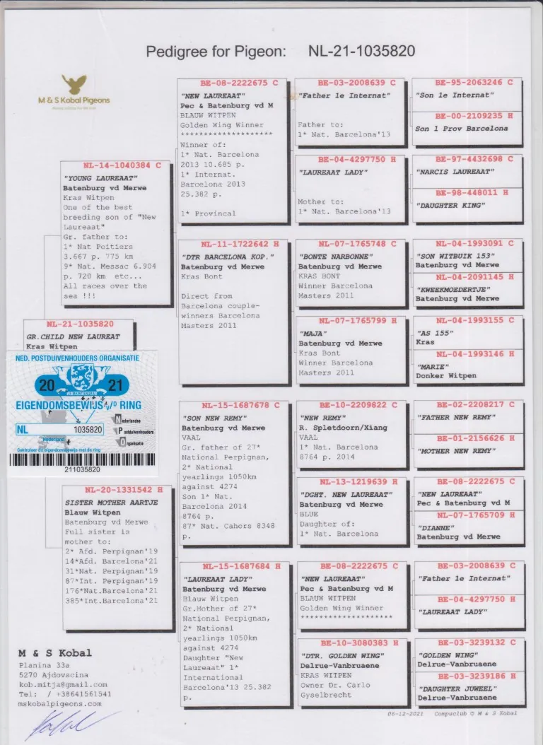 Uit: ”Young Laureaat”, (Gr) vader 1. Nat. Poitiers 3.667 d., 9. Nat. Messac 6.904 d., zoon ”New Laureaat”, 1. Int. Barcelona x ”Sister Mother Aartje”, uit dochter ”New Laureaat”, uit zoon ”New Remy” & ”Dtr. New Laureaat”
