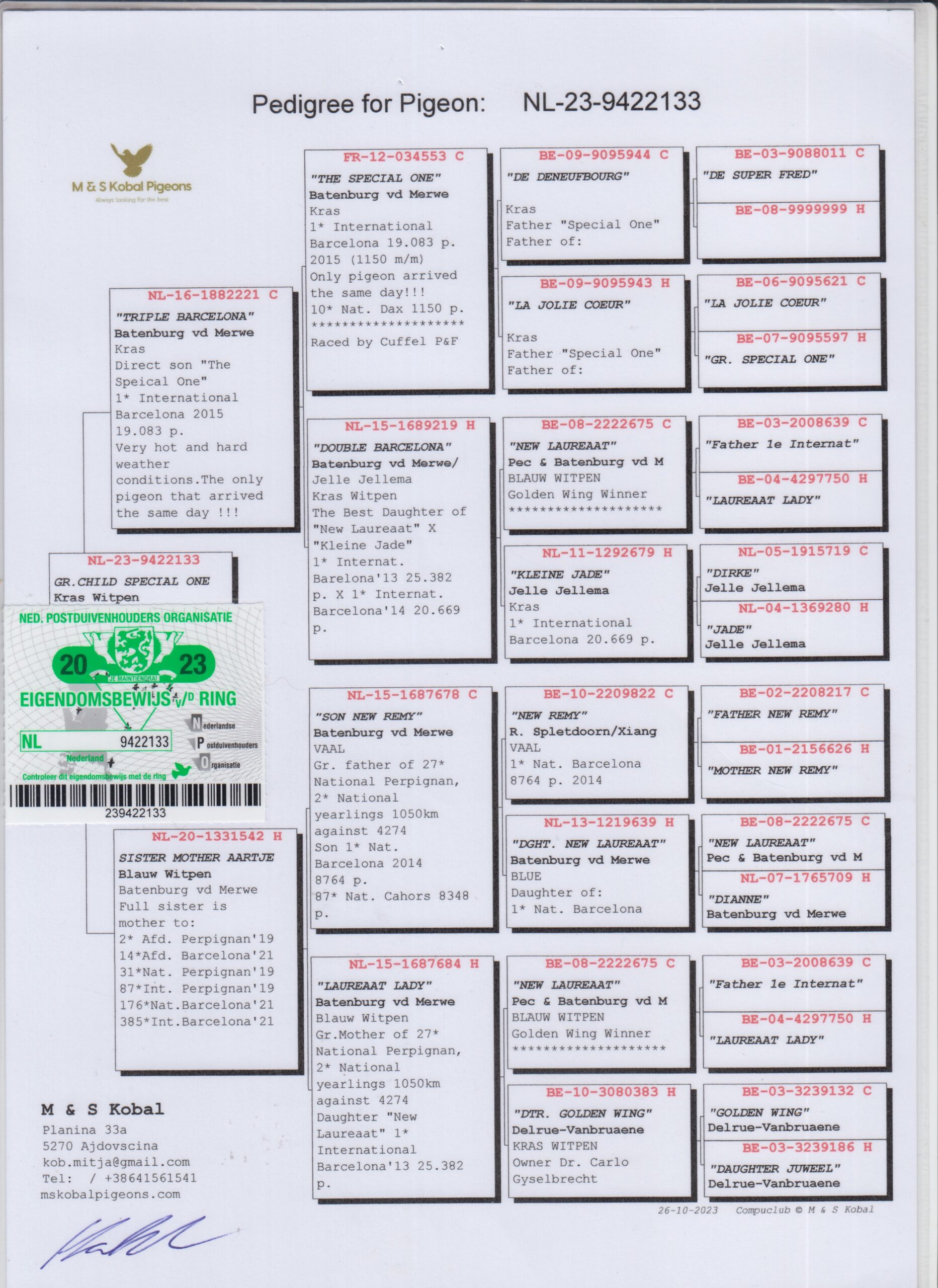 Uit: ”Triple Barcelona”, zoon ”The Special One”, 1. Int. Barcelona, uit dtr. ”New Laureaat” & ”Kleine Jade”, beide 1. Int. Barcelona x ”Sister Mother Aartje”, uit dtr. ”New Laureaat”, uit zoon ”New Remy” & ”D. New Laureaat”