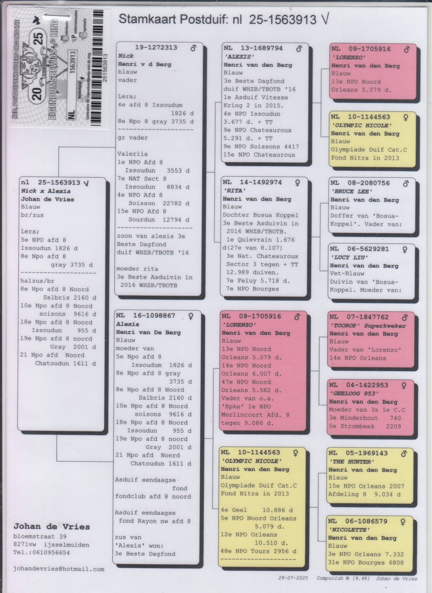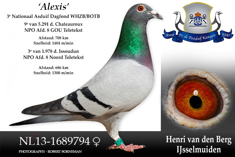 Uit: ”Nick”, vader 5. NPO Issoudun 1.826 d., 8. NPO Gray 3.735 d., gr-vader ”Valeriia”, 1. NPO Issoudun, 1. NPO Gien x ”Alexia”, moeder 5. NPO Issoudun 1.826 d., 8. NPO Gray 3.735 d., 8. NPO Noord Salbris, 10. NPO Noord Soissons