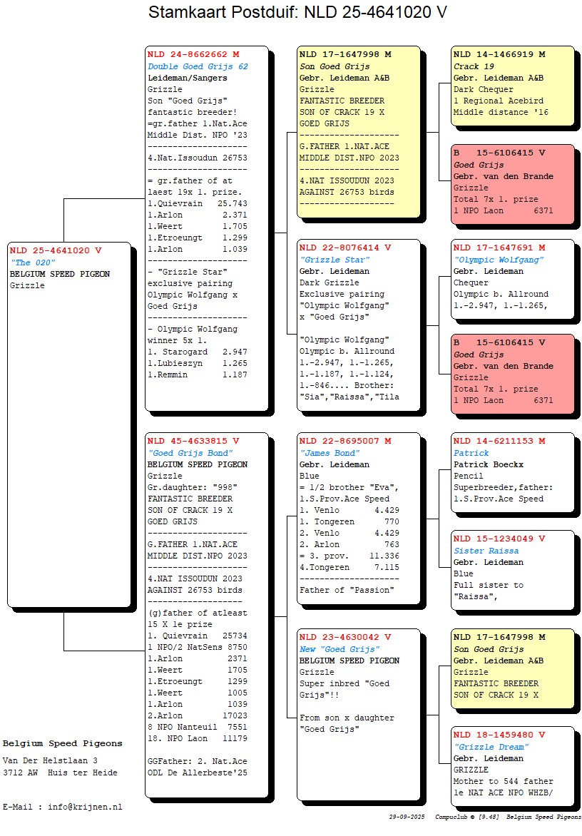 Uit: ”Double Goed Grijs 62”, uit zoon & dochter ”Goed Grijs”, 7x 1. Prijs & 1. NPO Laon 6.371 d., zoon ”Goed Grijs 998”, gr-vader 1. Nat. Asduif Midfond NPO x ”Goed Grijs Bond”, inteelt ”Goed Grijs”, 7x 1. Prijs & 1. NPO Laon 6.371 d.
