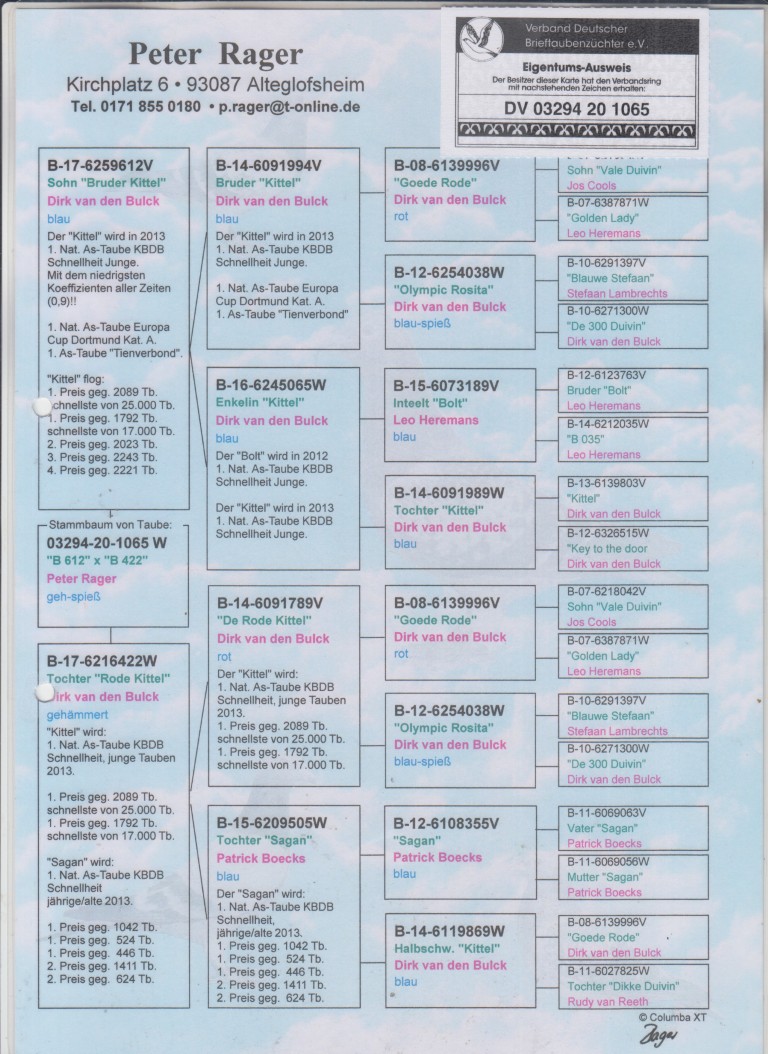 Uit: ”Sohn Bruder Kittel”, uit broer ”Kittel”, 1. Nat. Asduif Sprint KBDB, uit kld. ”Kittel” x ”Tochter Rode Kittel”, uit broer ”Kittel”, uit dochter ”Sagan”, 1. Nat. Asduif Sprint KBDB !!!!!!!!!!!!!!!!!!!!!!