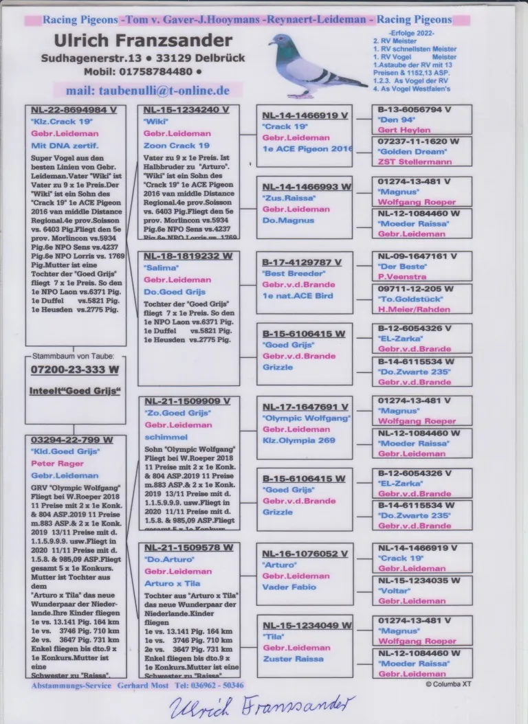 Grootvader ‘Olympic Wolfgang’ vliegt bij W. Roeper in 2018 11. Prijzen met 2 x 1. Konk. & 804 Aspkt. 2019: 11 prijzen met 883 Aspkt & 2. X 1. Konk.