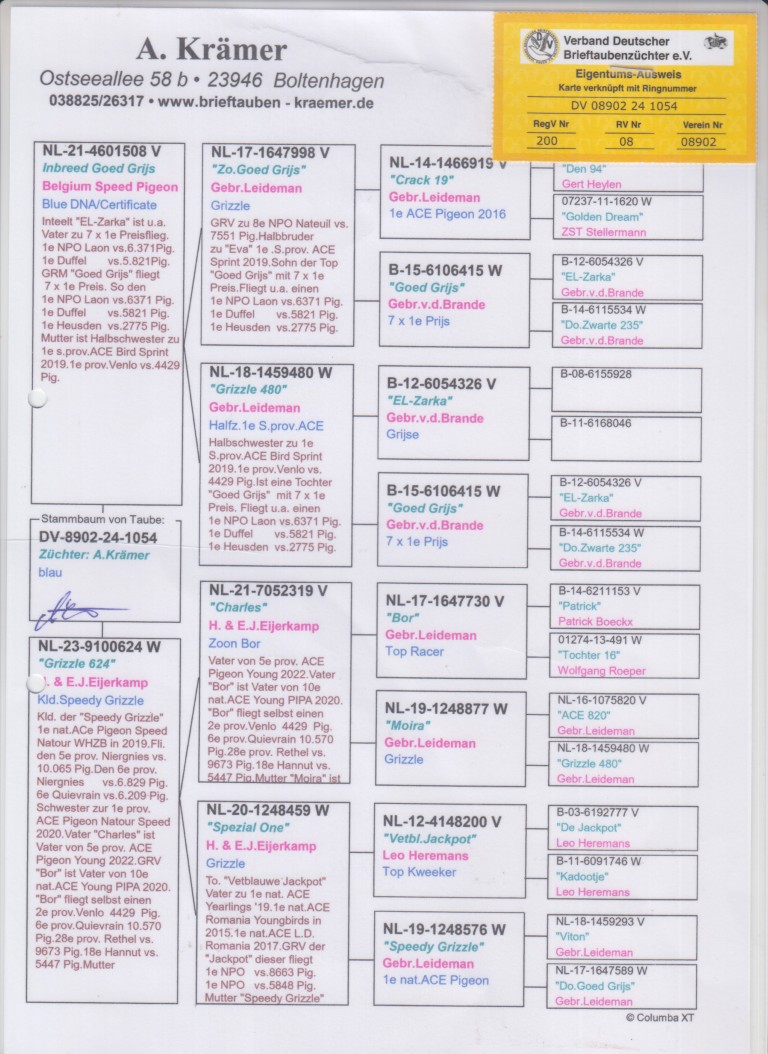 Vader: NL21-4601508. ‘Inbreed Goed Grijs’, Belgium Speed Pigeons.