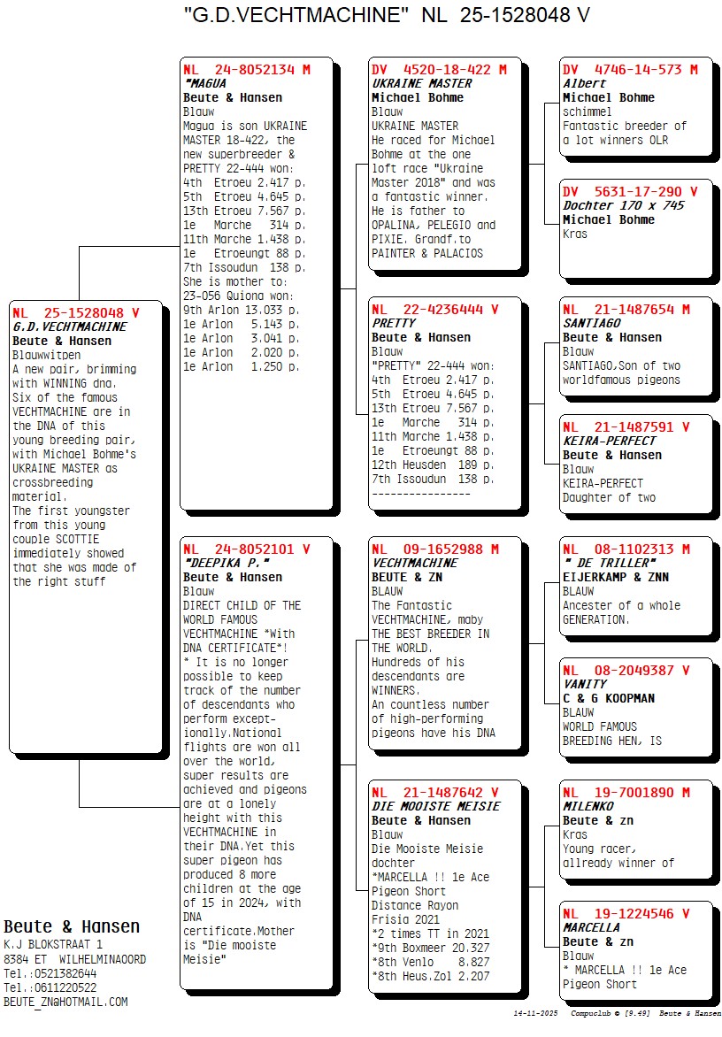 Uit: ”Magua”, 1/2 broer ”Quiana”, 1. Arlon 5.143 d., zoon ”Pretty”, 4.-2.417 d., 5.-4.645 d. x ”Deepika P.”, dochter ”Vechtmachine”, Unieke stamvader Beute & Hansen, uit dochter ”Marcella”, 1. Asduif Vitesse