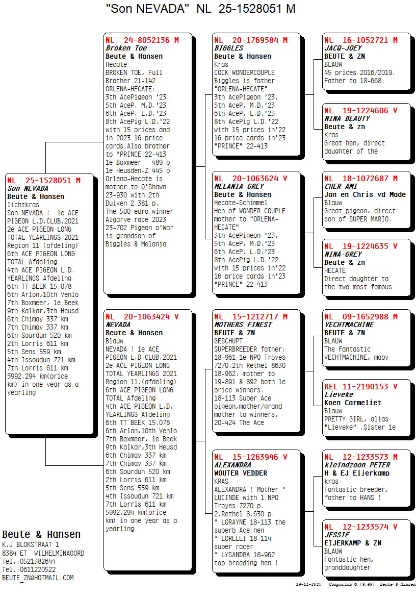Uit: ”Broken Toe”, broer ”Orlena-Hecate”, 3.-5.-6.-8. Asduif x ”Nevada”, 1. Asduif Dagfond Lokaal, 2. Prov. Asduif Jaarlingen, 6. Prov. Asduif Dagfond, uit zoon ”Vechtmachine”, Unieke Stamvader Beute & Hansen