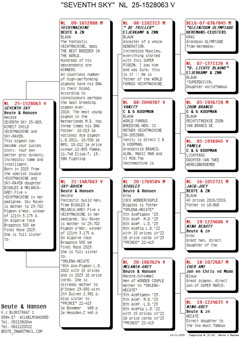 Uit: ”Vechtmachine”, Absolute stamvader en Nr. 1 kweker, nazaten winnen 1. Nat. Asduif Dagfond NPO, 1. Nat. Asduif Jonge Duiven Midfond NPO x ”Sky-Raven”, moeder 121. Finale OLR Golden Algarve 3.175 d.