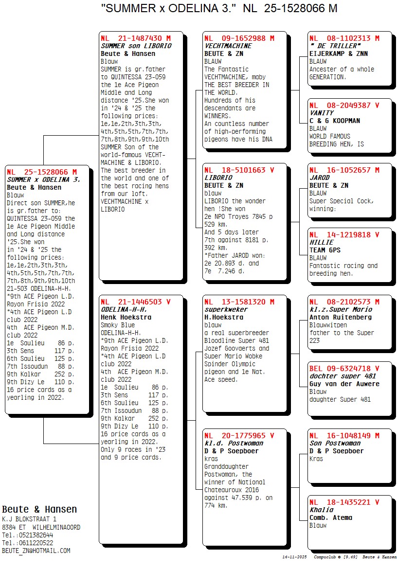 Uit: ”Summer”, gr-vader ”Quintessa”, 1. Asduif Midfond & Dagfond, zoon legendarische ”Vechtmachine”, Stamvader & Nr. 1 kweker Beute & Hansen, zoon ”Liborio”, 2. NPO x ”Odelina”, 9. Asduif Rayon Dagfond