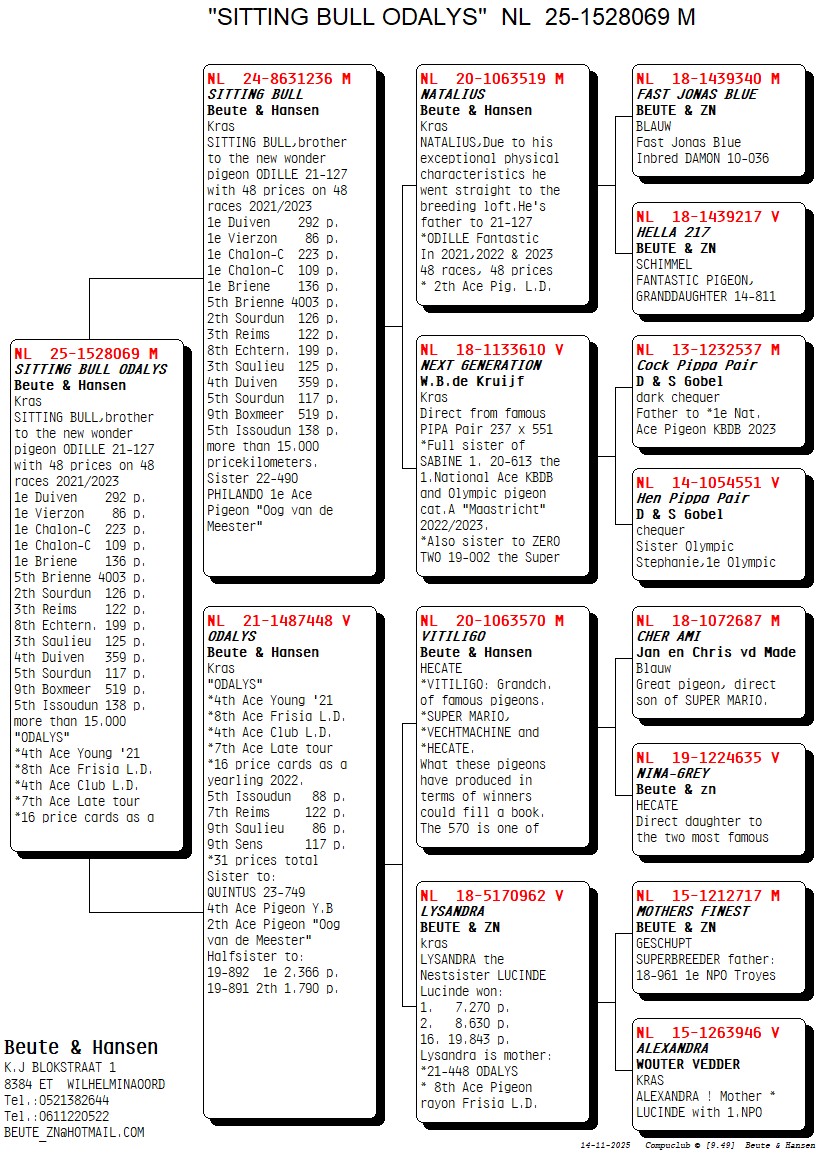 Uit: ”Sitting Bull”, broer ”Odille”, 5x 1. Prijs, uit zus ”Sabine 1”, 1. Nat. Asduif KBDB & Olympiade duif bij Tom van Gaver x ”Odalys”, 4. Asduif Jonge Duiven, 8. Asduif Dagfond Rayon, 1/2 zus 1.-2.366 d., 2.-1.790 d.