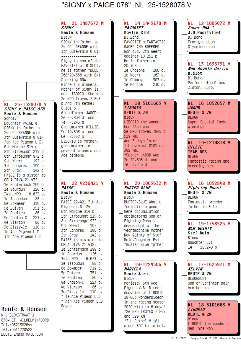 Uit: “Signy”, zoon “Favoriet”, 2.-10.251d., super kweker & “Liborio”, 2. NPO Troyes 7.845 d. x ”Paige”, 7. Asduif Dagfond, zus van 1. Asduif Dagfond & 3x 1. Prijs, uit dochter ”Liborio”, 2. NPO Troyes 7.845 d., 7.-8.181 d.