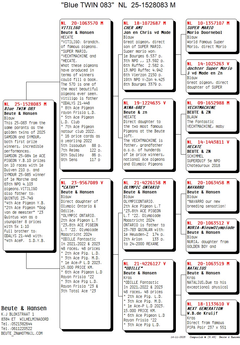 Uit: “Vitiligo”, top kweker, zoon “Cher Ami”, uit “Super Mario”, 1.+3.+6. NPO & “Nina-Grey”, dochter “Vechtmachine” x ”Cathy”, dochter ”Olympic Ontario”, vader van 1. Prijs Heusden Zolder, dochter ”Odille”