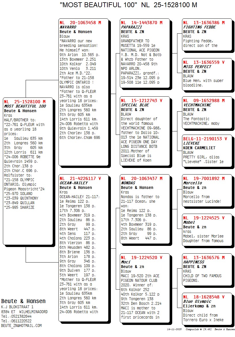 Uit: ”Navarro”, 9.-10.565 d., 10.-2.049 d., 10.-3.211 d., 13.-2.251 d., vader ”Olympic Ontario”, Olympiade duif x ”Ocean-Hailey”, 2x 1. Prijs, moeder ”Q-Fleur”, 1. Prijs Langres (560 km), dochter ”Nondas” & ”Maci”