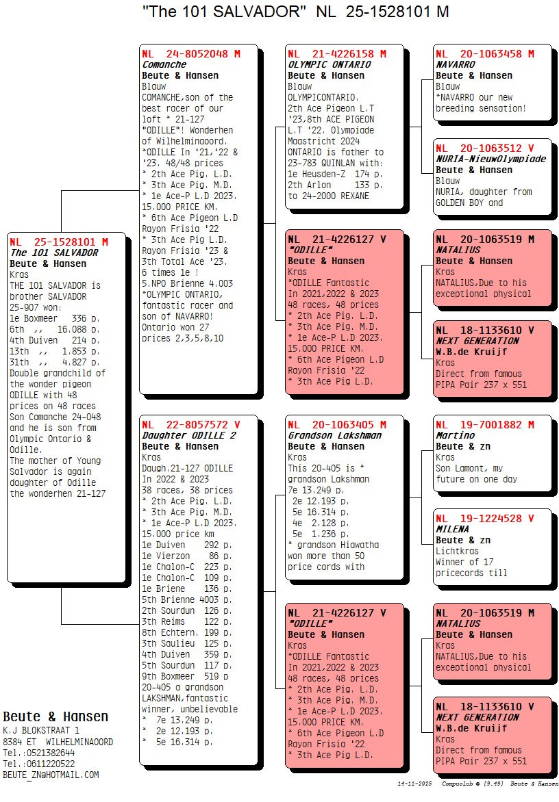 Uit: ”Comanche”, zoon ”Olympic Ontario”, Olympiade duif & ”Odille”, 1. Asduif Dagfond, 2. Asduif Dagfond, 3. Asduif Midfond x ”Daughter Odille 2”, dochter ”Odille”, 1. Asduif Dagfond, 2. Asduif Dagfond, 3. Asduif Midfond