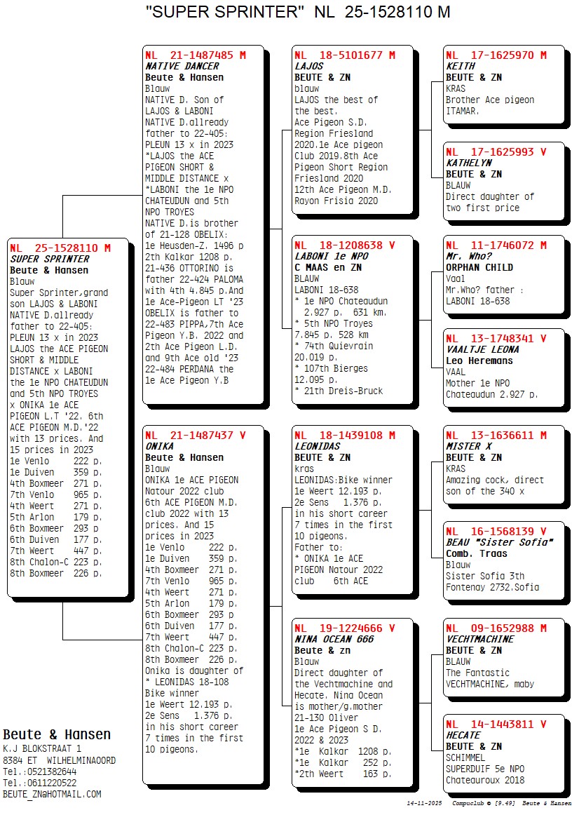 Uit: ”Native Dancer”, vader ”Lajos”, Asduif Vitesse & Midfond, zoon ”Laboni”, 1. NPO Chateaudun 2.927 d. x ”Onika”, 1. Asduif Natour Lokaal, 6. Asduif Midfond, 2x 1. Prijs, uit dochter legendarische ”Vechtmachine”