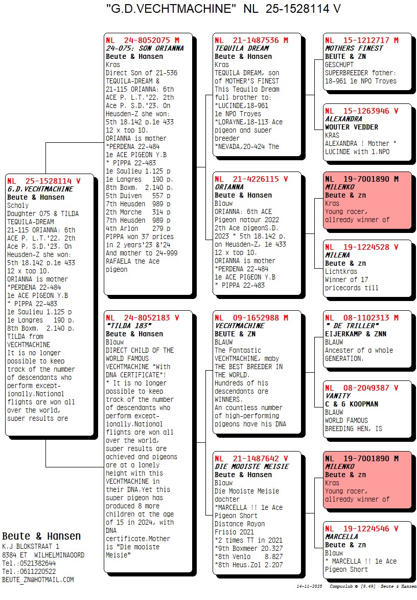 Uit: ”Son Orianna”, zoon ”Tequila Dream” & ”Orianna”, 2. Asduif Vitesse, 6. Asduif Natour & moeder ”Peredena”, 1. Asduif Jonge Duiven x ”Tilda 183”, dochter legendarische stamvader ”Vechtmachine”, uit dochter ”Milenko”
