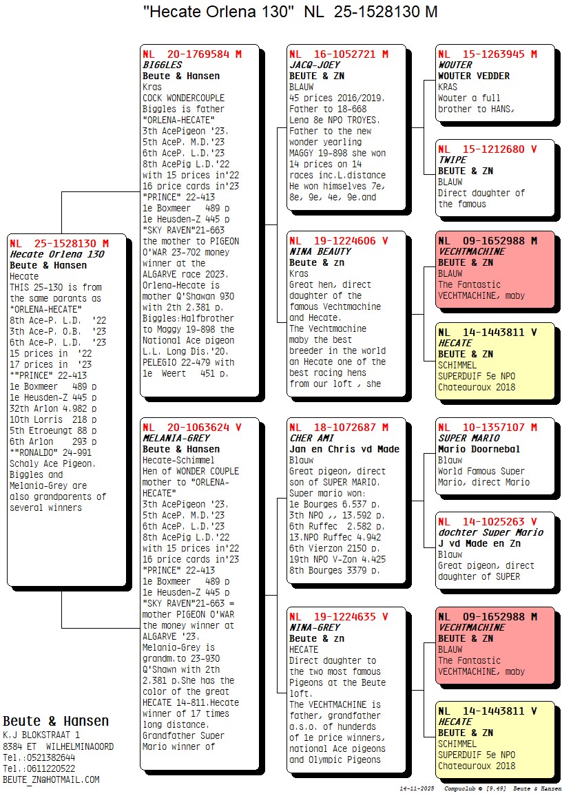 ‘De Vechtmachine’, is vader, grootvader enz. van honderden 1. Prijswinnaars, nationale Asduiven en Olympiadeduiven.