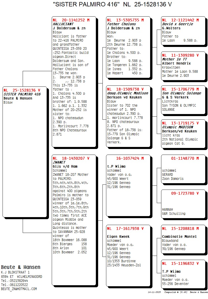 Uit: ”Halluciant”, uit dochter ”Olympic Madison” x ”Zwanet”, ouders: ”Palmiro”, 2.-3.-4.-4.-4.5.-8.-8.-etc. tegen gemiddeld 400 duiven & moeder ”Quintessa”, 2x 1. Asduif Midfond & Dagfond, 2x 1. Prijs winnaar