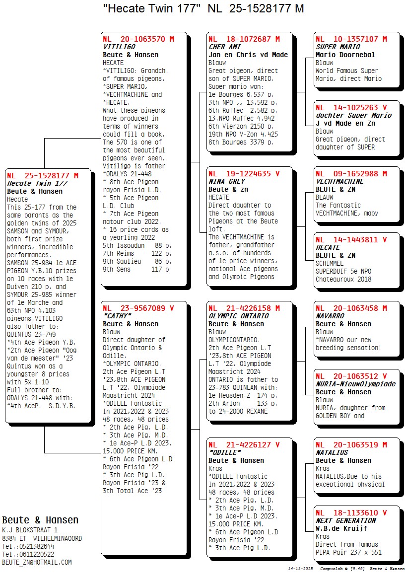 Uit: “Vitiligo”, top kweker, zoon “Cher Ami”, uit “Super Mario”, 1.+3.+6. NPO & “Nina-Grey”, dochter “Vechtmachine” x ”Cathy”, dochter ”Olympic Ontario”, vader van 1. Prijs Heusden Zolder, dochter ”Odille”