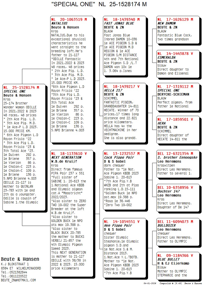 Uit: ”Natalius”, vader ”Odille” x ”Next Generation”, zus ”Sabine 1”, 1. Nat. Asduif KBDB & Olympiade duif