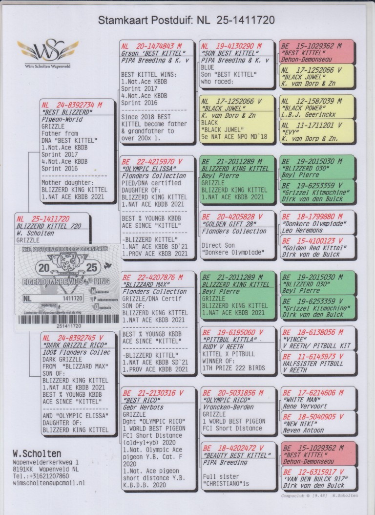 Uit: “Best Blizzard”, uit kl.zoon “Best Kittel & Black Juwel” & dochter “Blizzard King Kittel”, 1. Nat. Asduif KBDB x “Dark Grizzle Rico”, uit “Blizzard Max” & dochter “Olympic Rico”, 1. Nat. KBDB, 1. WBP.