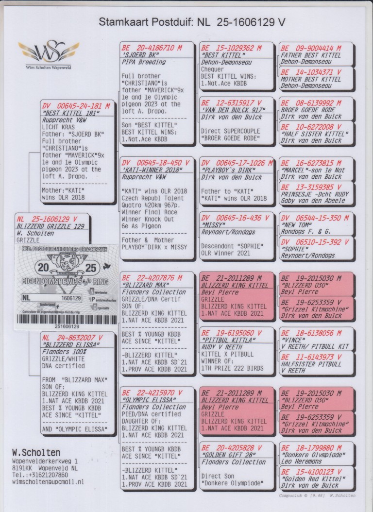 Uit: ”Best Kittel 181”, uit zoon ”Best Kittel”, 1. + 4. Nat. Asduif Sprint KBDB & legendarische kweker x ”Blizzerd Elissa”, uit zoon & dochter ”Blizzard King Kittel”, 1. Nat. Asduif Sprint KBDB.