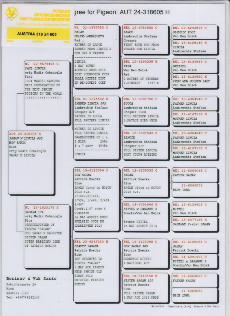Uit: ”Fahl Lincia”, Marcel Sangers, Super inteelt ”Lincia”, 1. Nat. Asduif KBDB x ”Sagana 174”, Patrick Boeckx, inteelt ”Sagan”, 1. Nat. Asduif Sprint KBDB, uit klz. ”Kittel”, 1. Nat. Asduif Sprint KBDB & legendarische kweker