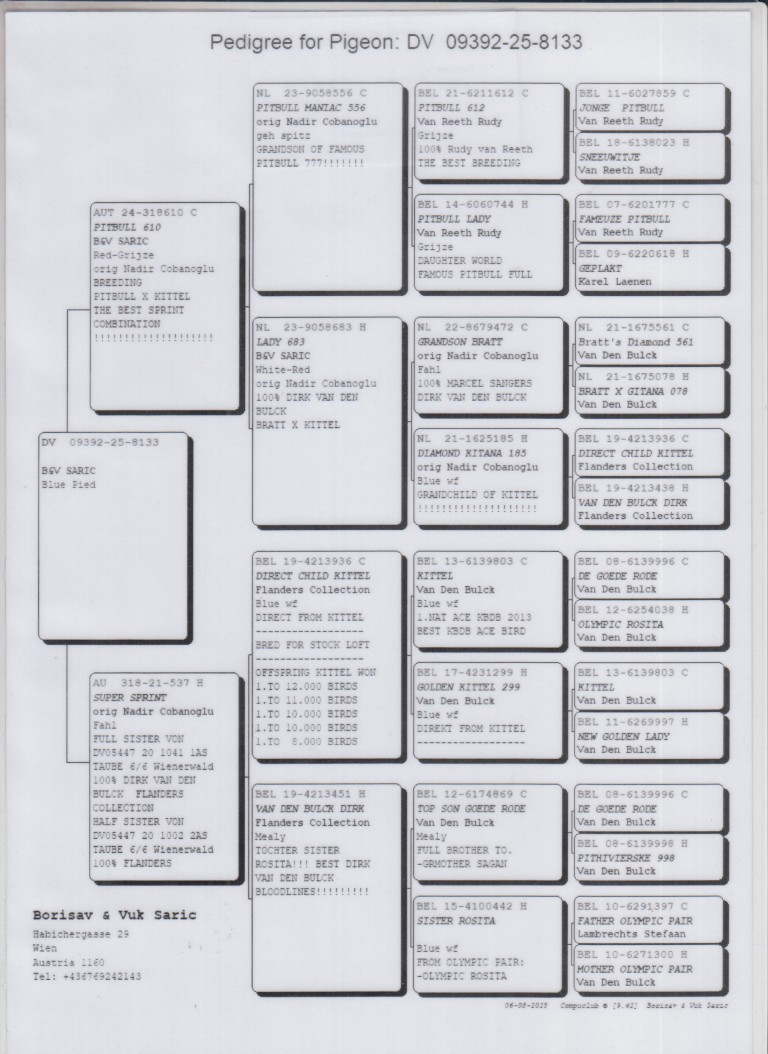 Uit: ”Pitbull 610”, inteelt ”Pitbull”, Rudy van Reeth, legendarische kweker & vlieger, nazaten winnen 6x 1. Nat. Asduif x ”Super Sprint”, v/d Bulck, uit inteelt zoon ”Kittel”, 1. Nat. Asduif KBDB & legendarische kweker