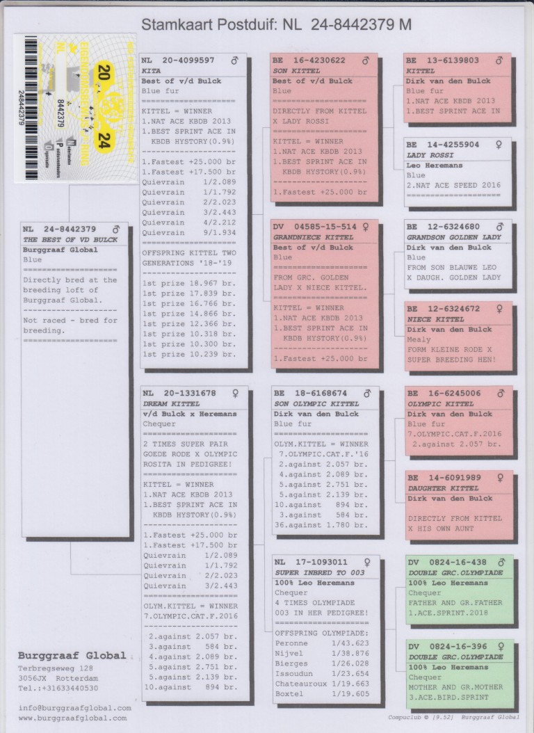 Uit: ”Kita”, uit zoon ”Kittel”, 1. Nat. Asduif Sprint KBDB x ”Dream Kittel”, uit zoon ”Olympic Kittel”, 7. Olympiade duif Cat. F, inteelt ”Olympiade 003”, Olympiade duif Cat. Snelheid, uit klz. ”Kittel”, 1. Nat. Asduif Sprint KBDB