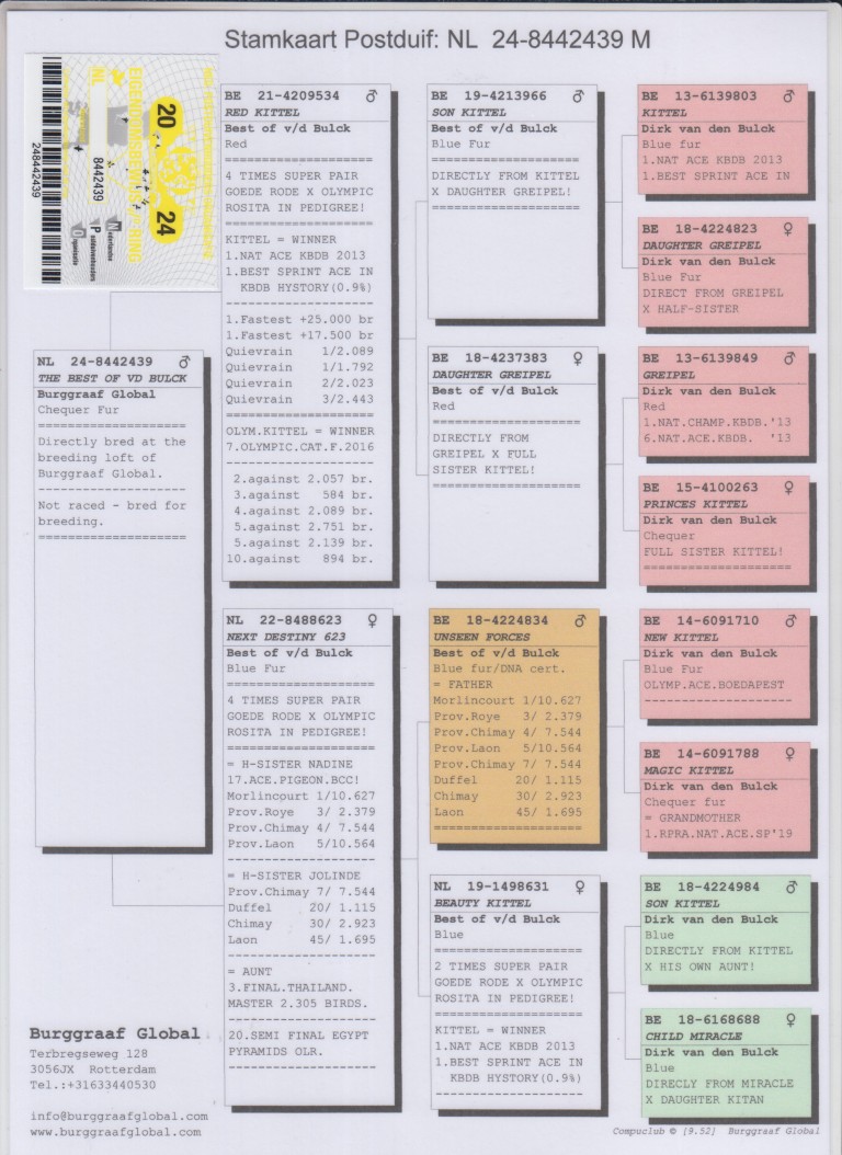 Uit: ”Red Kittel”, uit zoon ”Kittel”, 1. Nat. Asduif Sprint KBDB, uit dochter ”Greipel”, 6. Nat. Asduif Sprint KBDB x ”Next Destiny 623”, 1/2 zus 1.-10.627 d., 3. Prov. 2.379 d., dochter ”Unseen Forces” & zoon ”New Kittel”