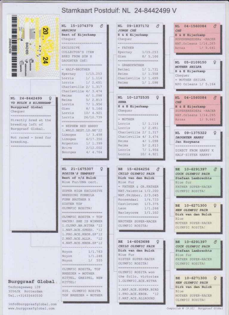 Uit: ”Marinos”, 1/2 broer 1.-15.253 d, 1.-2.651 d., 1.-1.114 d., 2.-1.317 d., uit zoon & dochter ”Ché” x ”Rosita’s Tempest”, inteelt ”Olympic Rosita”, 1. Olympiade duif Cat. Sprint & moeder ”Kittel”, 1. Nat. Asduif Sprint KBDB