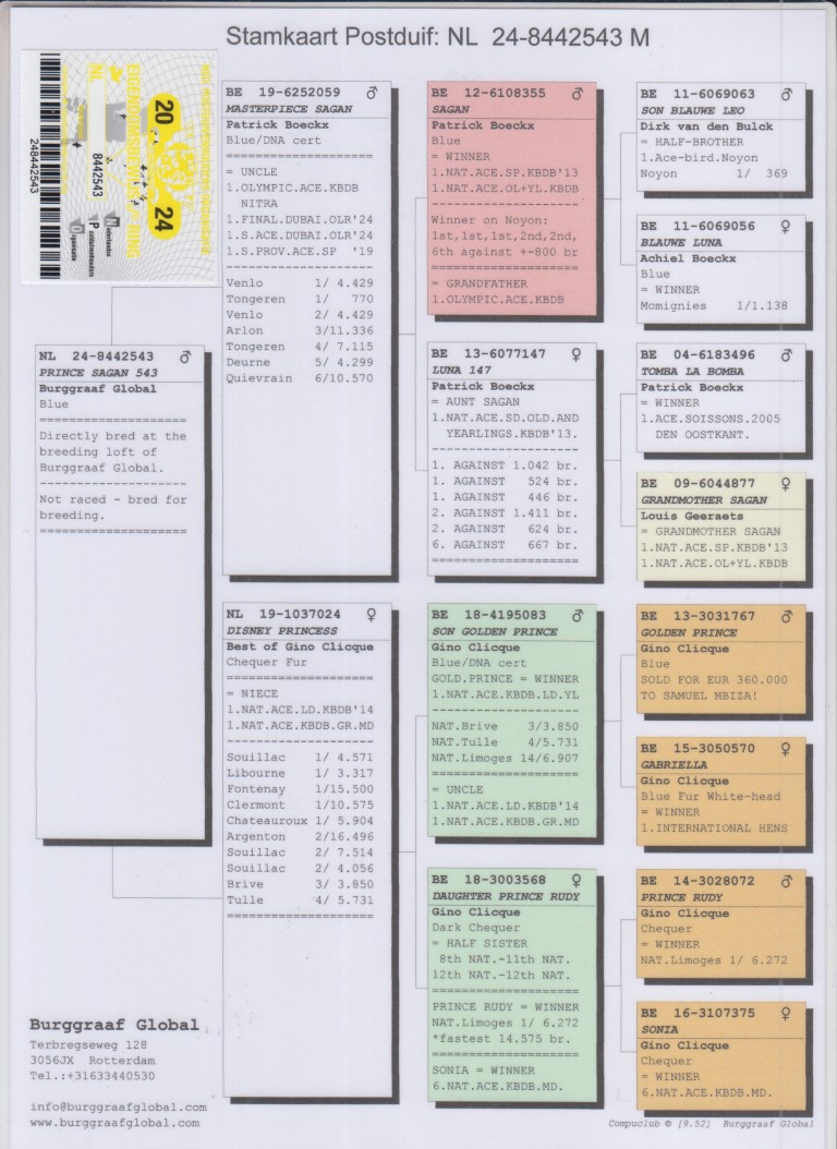 Uit: ”Masterpiece Sagan”, zoon ”Sagan”, 1. Nat. Asduif Sprint KBDB & gr-vader 1. Olympiade duif x ”Disney Princess”, uit zoon ”Golden Prince”, 1. Nat. Asduif Fond KBDB, uit dochter ”Prince Rudy”, 1. Nat. Limoges 6.272 d.