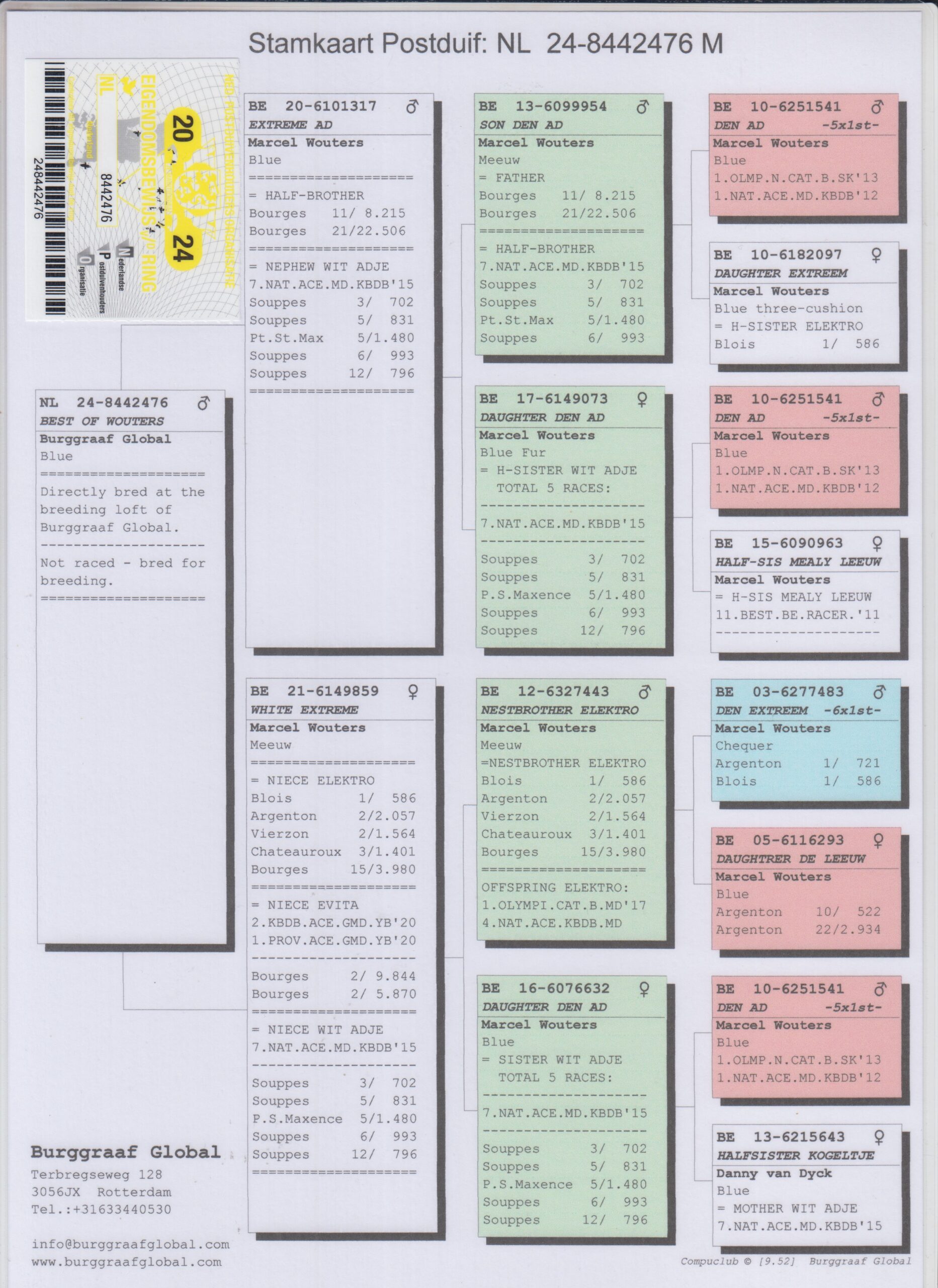 Uit: ”Extreme Ad”, uit zoon & dochter ”Den Ad”, 1. Olympiade duif Cat. Midfond, 1. Nat. Asduif KBDB Halve Fond x ”White Extreme”, uit zoon ”Extreem” & 1/2 broer ”Elektro”, uit dochter, ”Den Ad”, 1. Olympiade duif