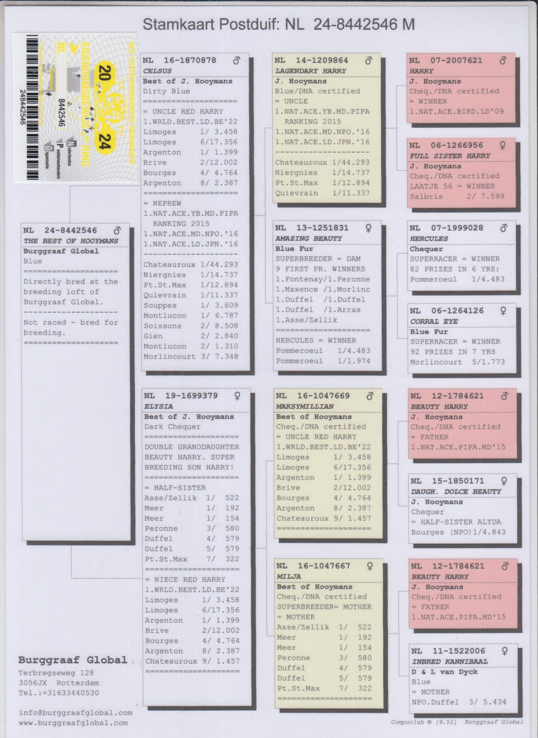 Uit: ”Celsus”, neef ”Red Harry”, 1. Nat. Asduif Fond FCI, uit zoon ”Harry”, 1. Nat. Asduif Dagfond WHZB & legendarische kweker x ”Elysia”, 1/2 zus 3x 1. Prijs, uit zoon & dochter ”Beauty Harry”, Superkweker