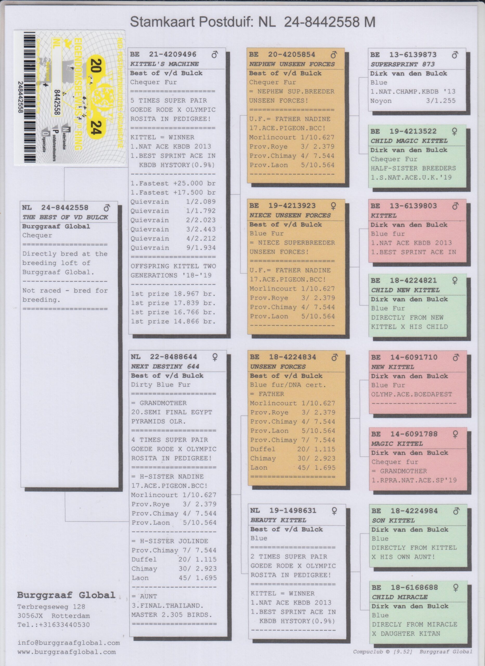 Uit: ”Kittel’s Machine”, uit dochter ”Kittel”, 1. Nat. Asduif Sprint KBDB x ”Next Destiny 644”, gr-moeder 20. Halve Finale OLR Pyramids Egypte, 1/2 zus 1.-10.627 d., 3. Prov. 2.379 d., 4. Prov. 7.544 d., dochter ”Unseen Forces”