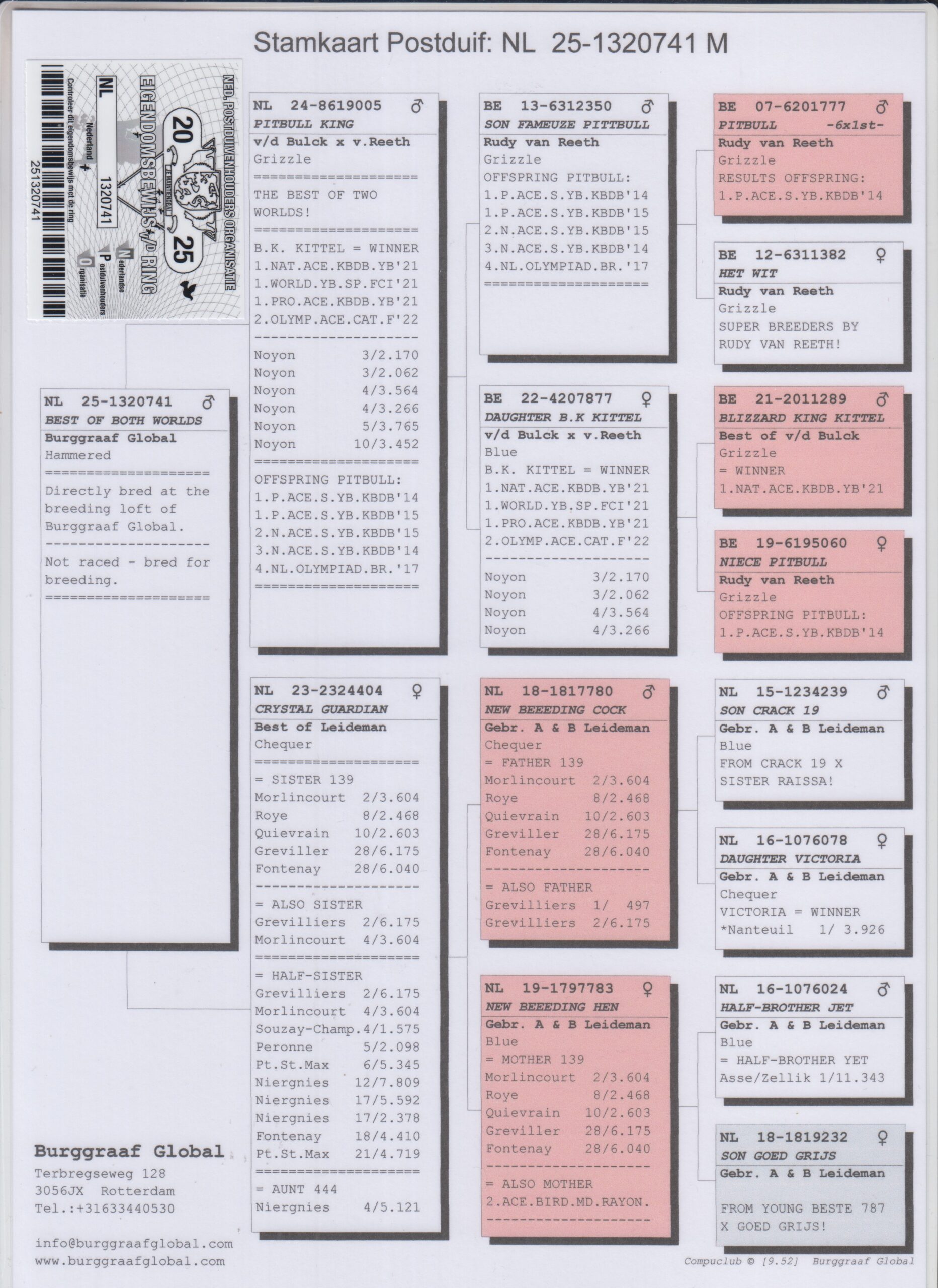 Uit: ”Pitbull King”, uit dochter ”Blizzard King Kittel”, 1. Nat. Asduif Sprint KBDB, uit zoon ”Pibtull”, nazaten winnen 4x 1. Nat. Asduif & Olympiade duif x ”Crystal Guardian”, (1/2) zus 2.-6.175 d., 2.-3.604 d., 4.-3.604 d., 4.-1.575 d.