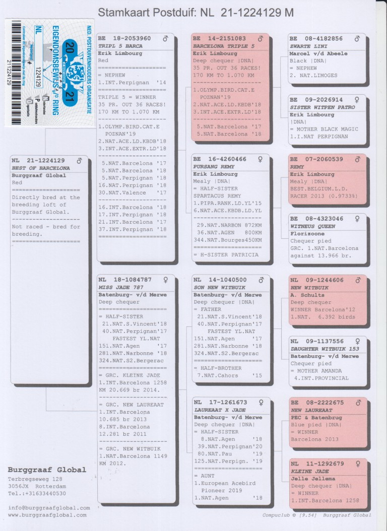 Uit: ”Triple 5 Barca”, zoon ”Barcelona Triple 5”, 1. Olympiade duif, 2. Nat. Asduif KBDB, 3. Int. Asduif, 5. Nat. Barcelona, 5. Nat. Barcelona, 5. Nat. Perpignan x ”Miss Jade 787”, uit dtr. ”New Laureaat” & ”Kleine Jade”