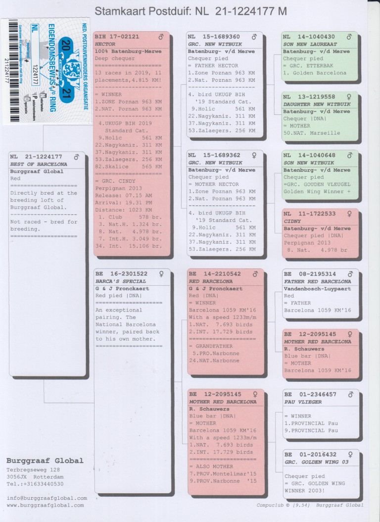Uit: ”Hector”, 1. Zone Poznan, 2. Nat. Poznan, lijn ”New Witbuik”, ”Cindy” & ”New Laureaat” x ”Barca’s Special”, dochter ”Red Barcelona”, 1. Nat. Barcelona 7.693 d., 1/2 zus ”Red Barcelona”, 1. Nat. Barcelona 7.693 d.