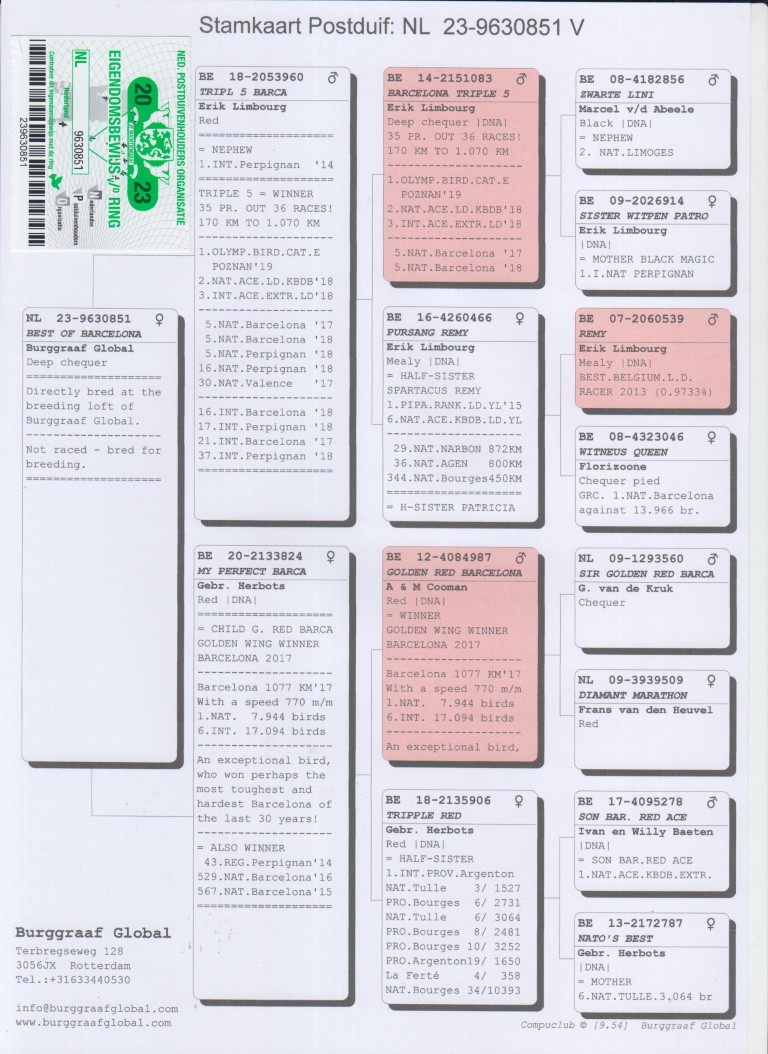 Uit: ”Triple 5 Barca”, zoon ”Barcelona Triple 5”, 1. Olympiade duif, 2. Nat. Asduif KBDB, 3. Int. Asduif, 5. Nat. Barcelona, 5. Nat. Barcelona x ”My Perfect Barca”, dtr. ”Golden Red Barcelona”, 1. Nat. Barcelona