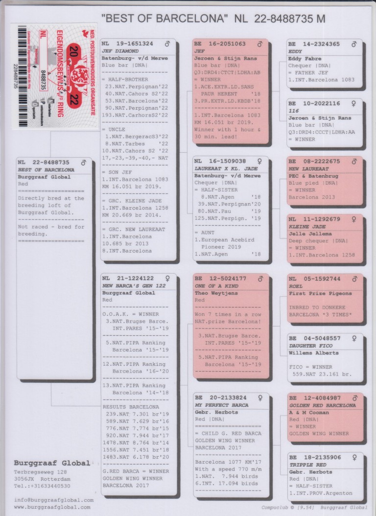Uit: ”Jef Diamond”, zoon ”Jef”, 1. Int. Barcelona 16.051 d. (90 min vooruit), uit dochter ”New Laureaat” & ”Kleine Jade” x ”New Barca’s Gen 122”, dochter ”One of a Kind”, 5., 12. & 13. Nat. Asduif Barcelona