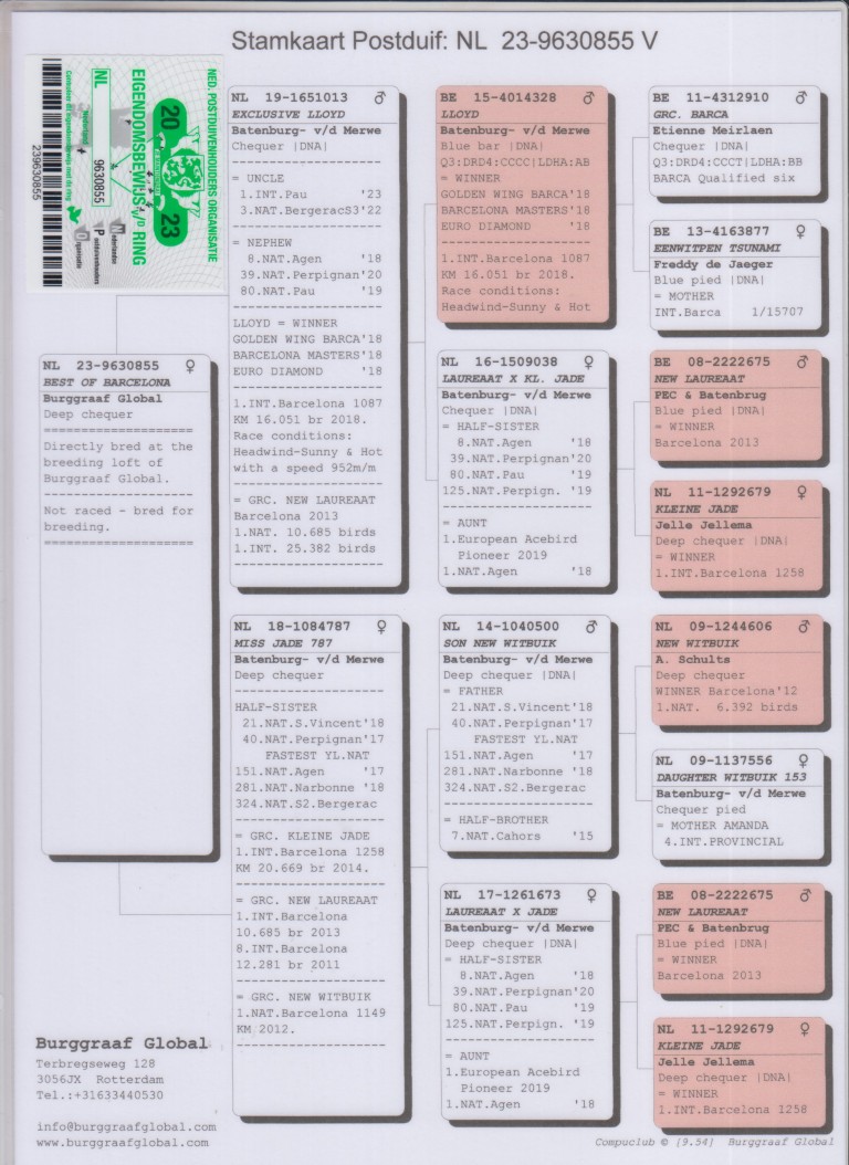 Uit: ”Excluive Lloyd”, zoon ”Lloyd”, 1. Int. Barcelona 16.051 d., uit dochter ”New Laureaat”, 1. Int. Barcelona 25.382 d. x ”Miss Jade 787”, uit dochter ”New Laureaat”, 1. Int. Barcelona, uit zoon ”New Witbuik”, 1. Nat. Barcelona