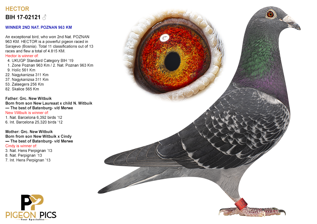 Uit: ”Hector”, 1. Zone Poznan, 2. Nat. Poznan, uit klz. ”New Laureaat”, 1. Int. Barcelona 25.382 d., uit klz. x kld. ”New Witbuik”, 1. Nat. Barcelona x ”Next Alegria”, dochter ”Alegria”, 1. Nat. Barcelona & 3. Int. Barcelona 15.707 d.