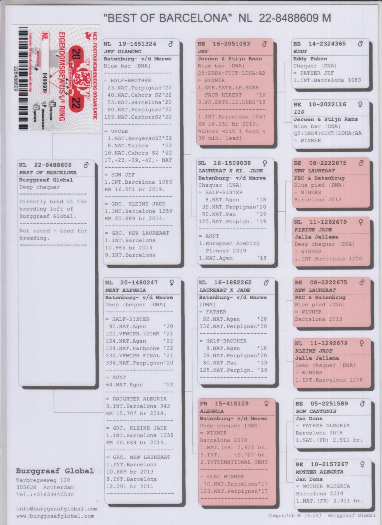 DNA certified. Is vader ‘Jef’, 1. Int. Barcelona 1083 km.