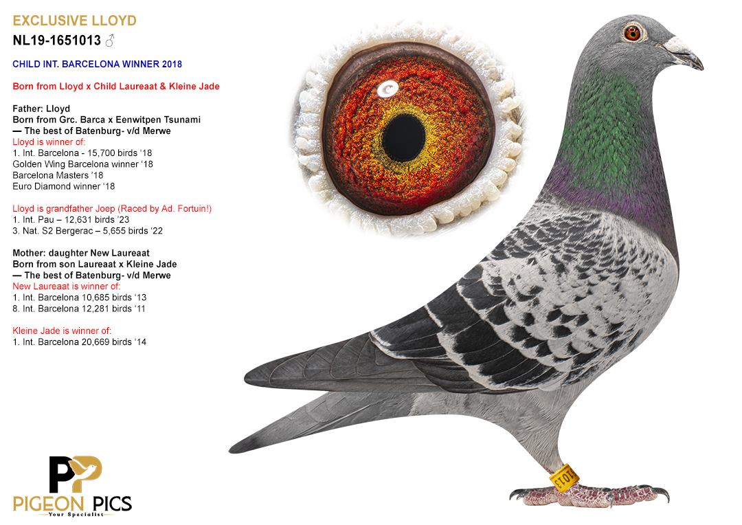 Uit: ”Excluive Lloyd”, zoon ”Lloyd”, 1. Int. Barcelona 16.051 d., uit dochter ”New Laureaat”, 1. Int. Barcelona 25.382 d. x ”Miss Jade 787”, uit dochter ”New Laureaat”, 1. Int. Barcelona, uit zoon ”New Witbuik”, 1. Nat. Barcelona