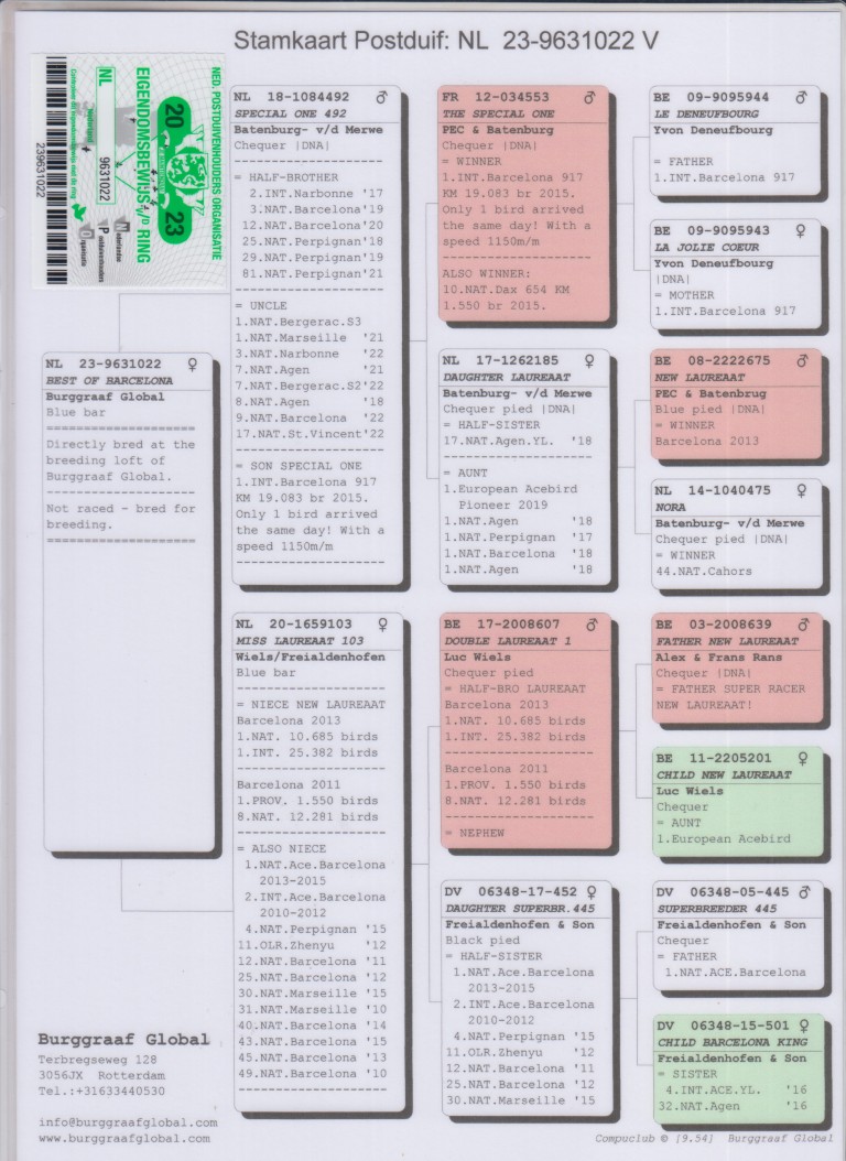 Uit: ”Special One 492”, zoon ”The Special One”, 1. Int. Barcelona 19.083 d., uit dochter ”New Laureaat”, 1. Int. Barcelona 25.382 d. x ”Miss Laureaat 103”, uit 1/2 broer ”New Laureaat”, 1. Int. Barcelona 25.382 d.