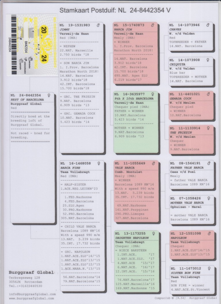 Uit: ”Jimmy”, Comb. Verweij-de Haan, zoon ”Barca Jim”, 1. Inter-Prov. Barcelona, 14. Nat. Barcelona 3.912 d. x ”Barca Fire”, dochter ”Vale Barca”, 13. Nat. Barcelona, uit dtr. ”Napoleon”, 3x 1. Nat. Asduif Int. Vluchten