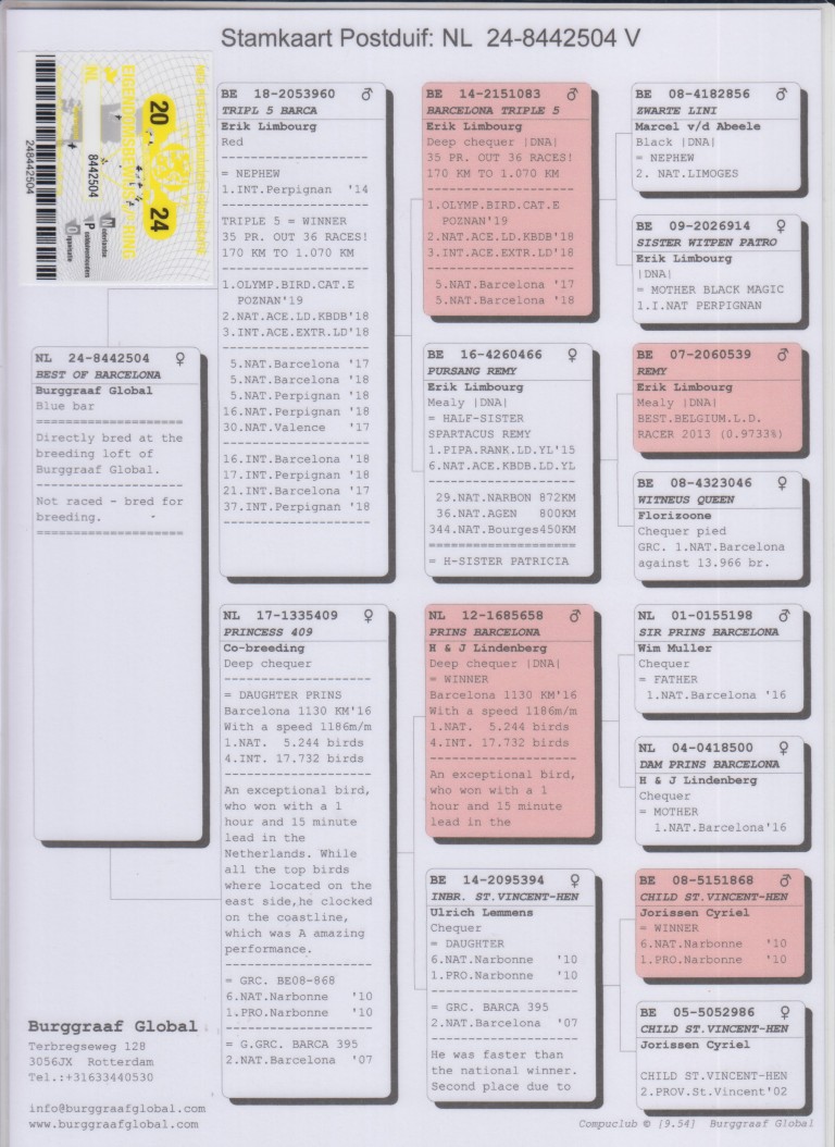 Uit: ”Triple 5 Barca”, zoon ”Barcelona Triple 5”, 1. Olympiade duif, 2. Nat. Asduif KBDB, 3. Int. Asduif, 5. Nat. Barcelona, 5. Nat. Barcelona, 5. Nat. Perpignan x ”Princess 409”, dtr. ”Prins Barcelona”, 1. Nat. Barcelona