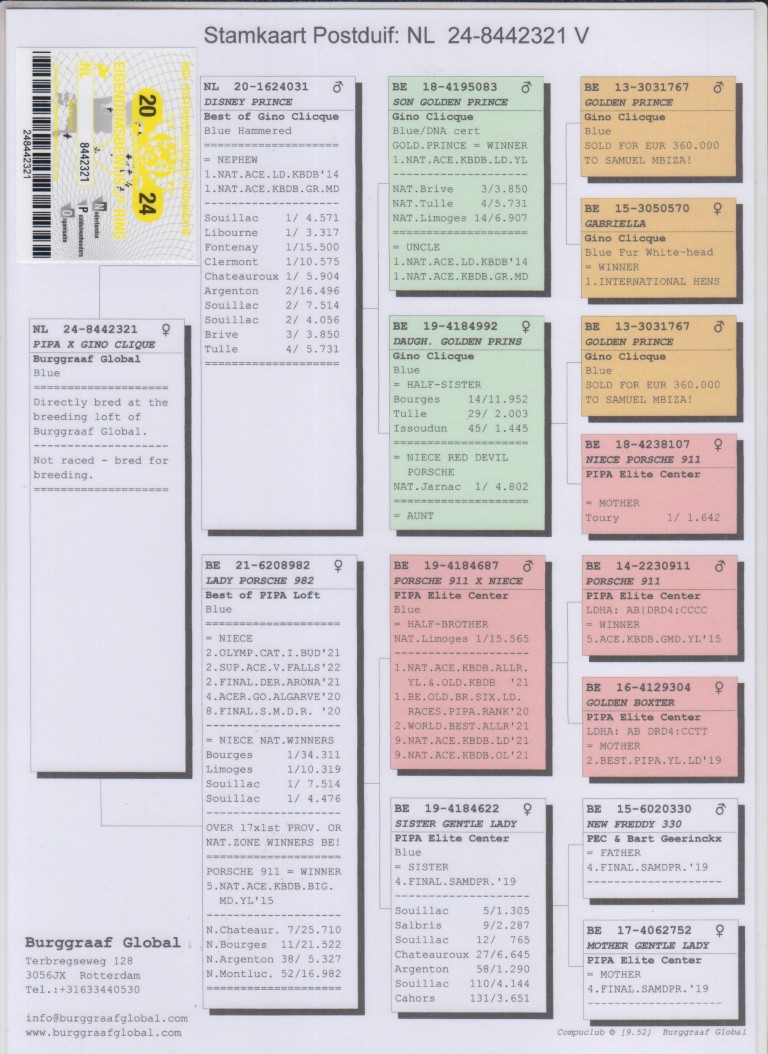 Uit: ”Disney Prince”, uit zoon & dochter ”Golden Prince”, 1. Nat. Asduif Fond KBDB, 3. Nat. Brive, 4. Nat. Tulle, 14. Nat. Limoges x ”Lady Porsche 982”, uit zoon ”Porsche 911”, 5. Nat. Asduif KBDB & Stamkweker PEC