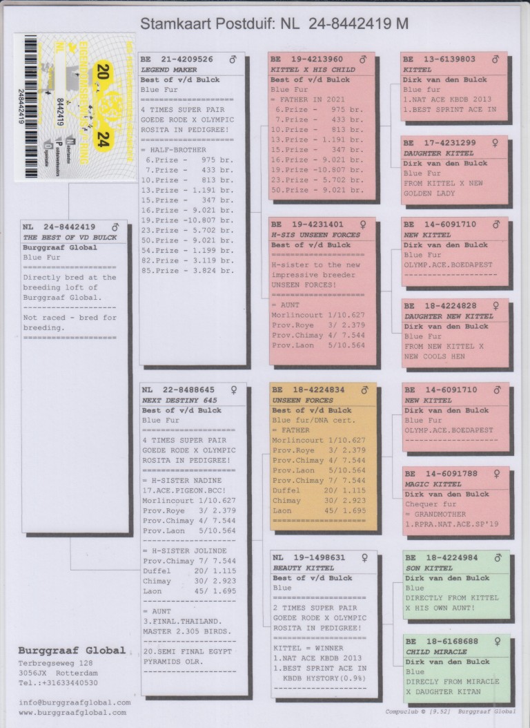 Uit: ”Legend Maker”, uit zoon ”Kittel”, 1. Nat. Asduif Sprint KBDB, uit dochter ”New Kittel” x ”Next Destiny 645”, dochter ”Unseen Forces”, vader 1.-10.627 d., 3. Prov. 2.379 d., 4. Prov. 7.544 d. & zoon ”New Kittel”