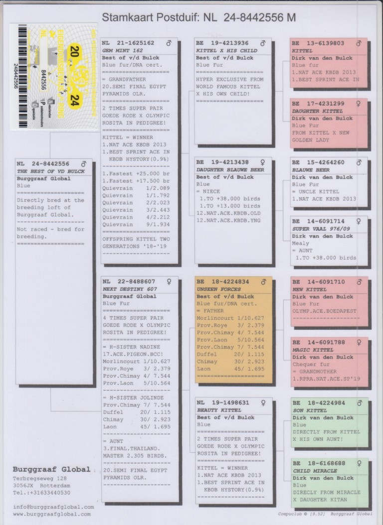 Uit: ”Gem Mint 162”, gr-vader 20. Halve Finale OLR Egypte Pyramids, uit zoon ”Kittel”, 1. Nat. Asduif Sprint KBDB x ”Next Destiny 607”, dochter ”Unseen Forces”, vader 1.-10.627 d., 3. Prov. 2.379 d. & zoon ”New Kittel”
