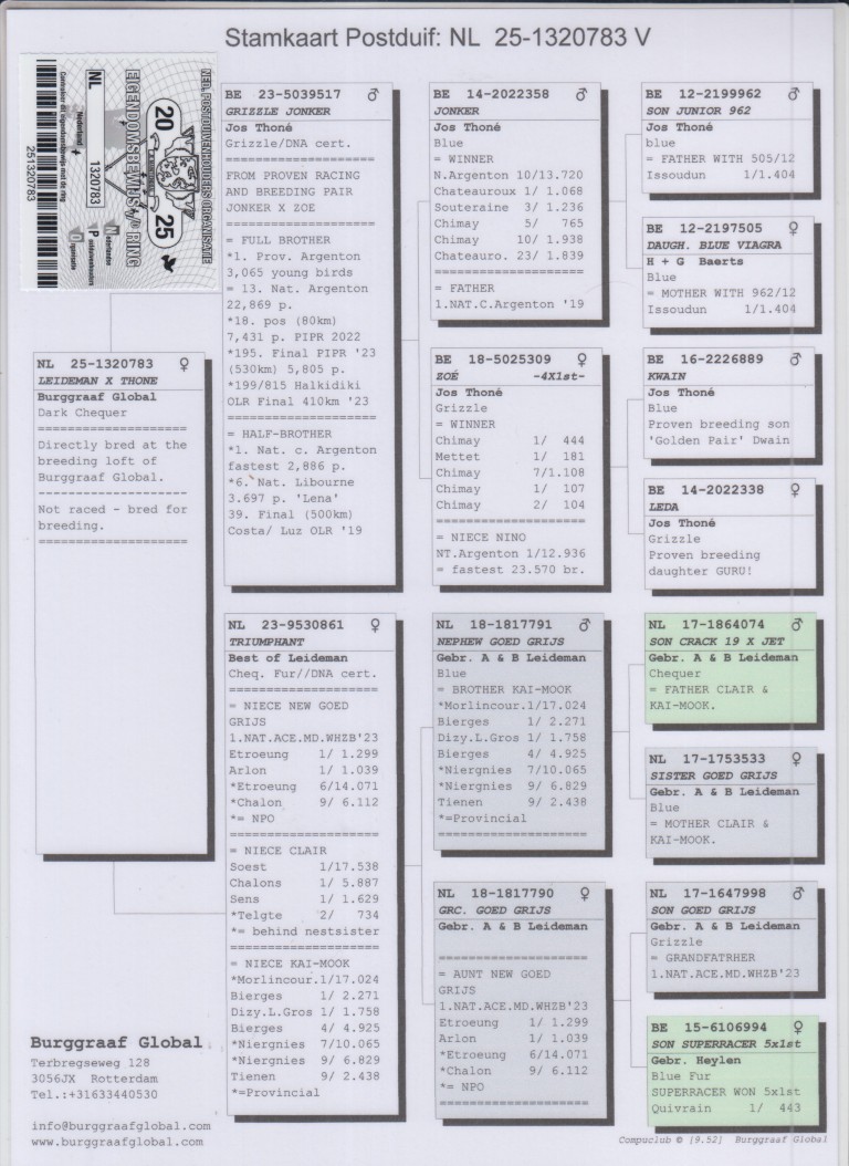 Uit: ”Grizzle Jonker”, Jos Thoné, broer 1. Prov. Argenton 3.065 d., 1/2 broer 6. Nat. Libourne 3.697 d., zoon ”Zoë”, 4x 1. Prijs x ”Triumphant”, inteelt ”Goed Grijs”, 7x 1. Prijs & 1. NPO Laon 6.371 d., nazaten winnen 7x 1. Nat. Asduif