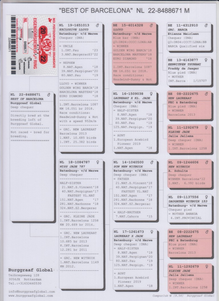 Uit: ”Excluive Lloyd”, zoon ”Lloyd”, 1. Int. Barcelona 16.051 d., uit dochter ”New Laureaat”, 1. Int. Barcelona 25.382 d. x ”Miss Jade 787”, uit dochter ”New Laureaat”, 1. Int. Barcelona, uit zoon ”New Witbuik”, 1. Nat. Barcelona